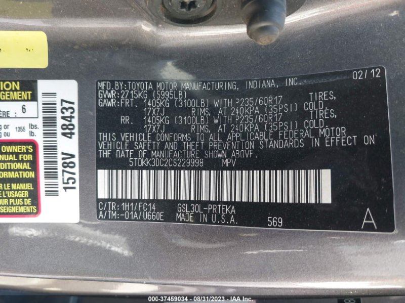 TOYOTA SIENNA 11-16 2012